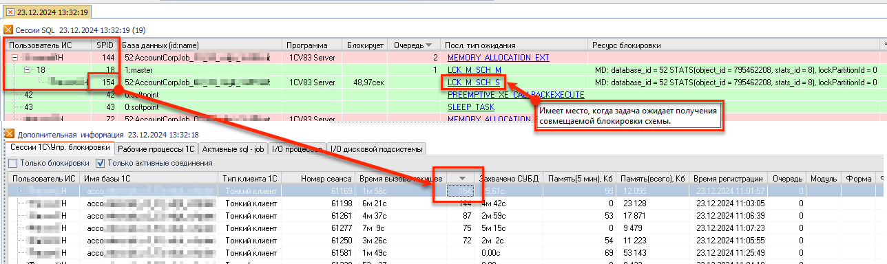 У пользователя SPID 144 выполняется длительный запрос. Оптимизатор запросов вдруг принимает решение о том, что нужно обновить статистики, т. к. они устарели. Запускается фоновый процесс со SPID 18, который обновляет статистику параллельно с активностью других соединений, и в самом конце ему нужно заменить старую статистику на новую. Накладывается блокировка схемы, и системное соединение ждёт монопольного доступа. Появляется первая блокировка между SPID 18 и 144. Теперь любой другой запрос к данной таблице будет заблокирован и завершён по таймауту. В дереве блокировок таким заблокированным сеансом является соединение SPID 154.