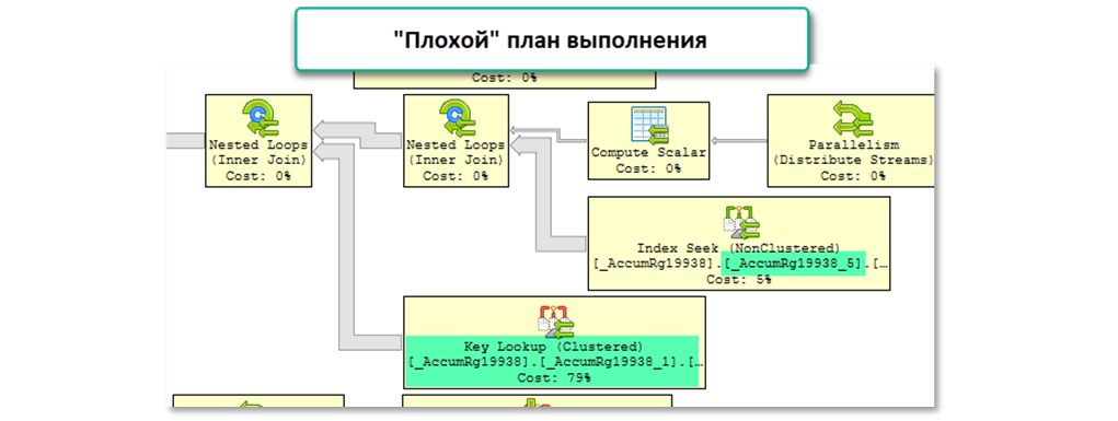 В «плохом» плане оптимизатор выбрал некластерный индекс «_AccumRg19938_5», в результате чего выполняется дополнительная операция «Key Lookup». Индекс «_AccumRg19938_5» не содержит всех необходимых полей и оптимизатор вынужден обращаться к основному (кластерному) индексу, чтобы их дополучить – из-за этого такое огромное количество логических чтений.