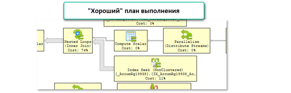 Оптимизатор ошибается при выборе индекса таблицы «_AccumRg19938». Вот два фрагмента «плохого» и «хорошего» планов выполнения запросов: