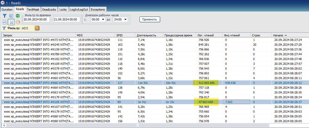 Вот в качестве примера пример трассы такого тяжелого запроса, который периодически (не всегда!) плохо себя ведет. Это выражается в количестве логических чтений который он выполняет в ходе выполнения.