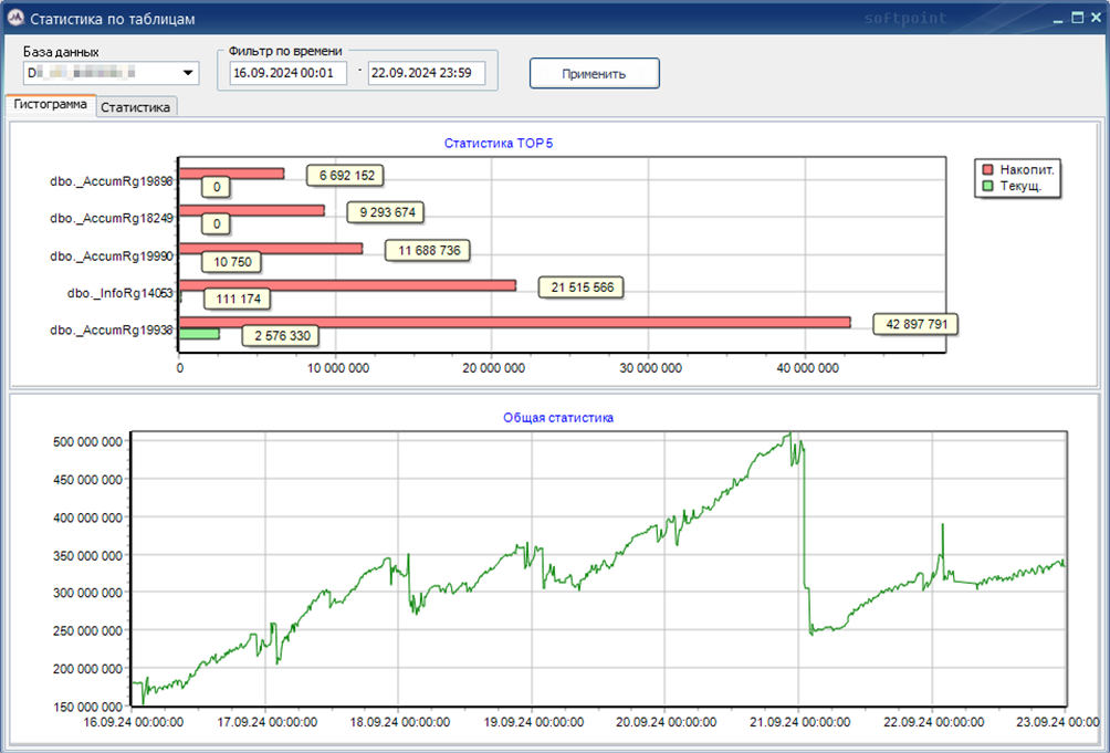 На рисунке выше выделены две строки одного и того же запроса, когда количество логический чтений вырастает на порядки. Запрос использует два регистра накопления (ACCUMRG19938 и ACCUMRG19820) с большим количеством строк и несколько временных таблиц. Если посмотреть отчет по изменению статистик базы данных за неделю, то видим, что суммарное количество изменений по таблицам с последнего пересчета статистик имеет тренд на увеличение и даже ночные попытки пересчитывать статистики (падения зеленого графика) выполняются не полностью – график не падает до нуля, и рост изменений на следующий день продолжается. Причины почему так может быть разберем позже, а сейчас просто зафиксируем этот факт.