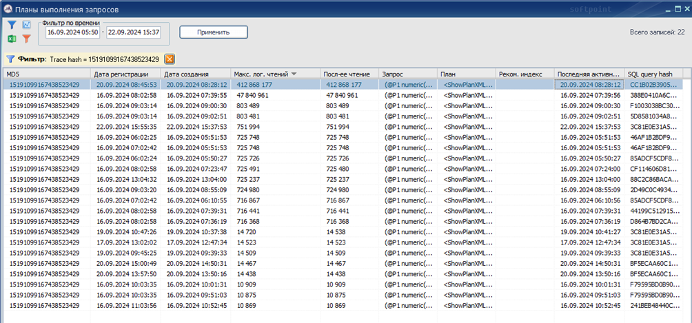 Если посмотреть все планы для этого запроса за неделю, то как раз можно увидеть как различаются планы запроса. Интересующий нас «плохой» план в самой верхней строке – выполняет 412 млн. логических чтений.