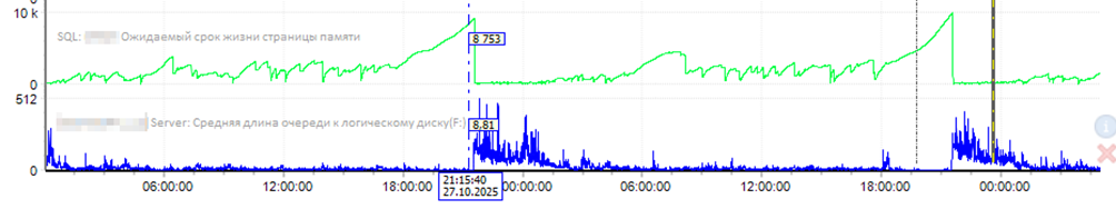 Как это увидеть? Есть счетчик PLE (Ожидаемый срок жизни страницы памяти), который показывает эффективность использования буферного кэша. Идеальное его поведение – это рост в течение рабочего дня и «обрушение» только во время регламентных работ. На рисунке ниже видим, что график PLE (зеленый) за несколько дней явно далек от идеальной картины мира. Поэтому при выполнении запросов SQL-сервер обращается за данными к диску. Обратите внимание на синий график – как только PLE падает, начинаются значительные очереди к диску.