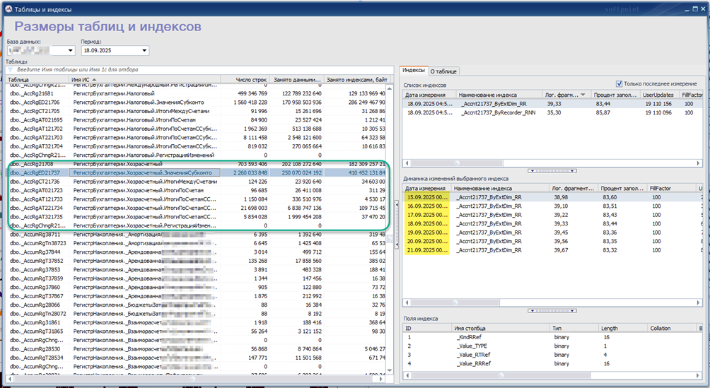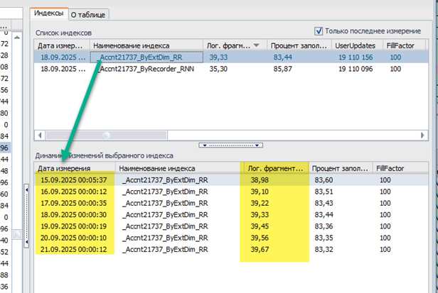Если вернуться к предыдущему рисунку с индексами регистра бухгалтерии, то обратите внимание на процент фрагментации по одному из индексов, который в течение недели стабильно держится в диапазоне 38-39%: