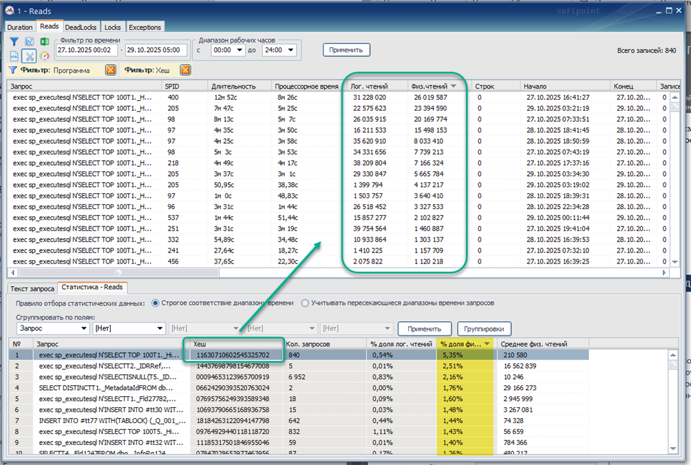В нижней панели рисунка – группы запросов, отсортированные по нагрузке на диск (доле физических чтений). Возьмем первый вид запроса с хешем 11630710602545325702. В верхней панели выведен весь список из 840 запросов этой группы. Хорошо видно, что каждый такой запрос делает очень много не только логических чтений (из памяти), но и физических (с диска). Возьмем, к примеру верхние строчки. Видим 20-30 млн. логических чтений, из которых почти столько же делается с диска. Т.е. запросу почти всегда не хватает буферного пула, и он обращается к диску. В целом 30 млн. логических чтений – это очень много и кэша, конечно, не хватит. Поэтому главный вектор улучшения производительности здесь должен лежать в плоскости оптимизации самих запросов, чтобы они выполнялись с меньшим количеством логических чтений и, как следствие, с меньшим количеством физических чтений или вообще без них. А фрагментация индекса – это дело даже не второго порядка. Под оптимизацией подразумевается не только переписывание запроса на стороне приложения, но и индексный тюнинг.
