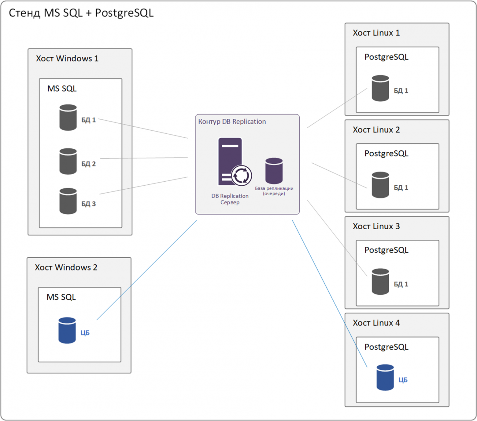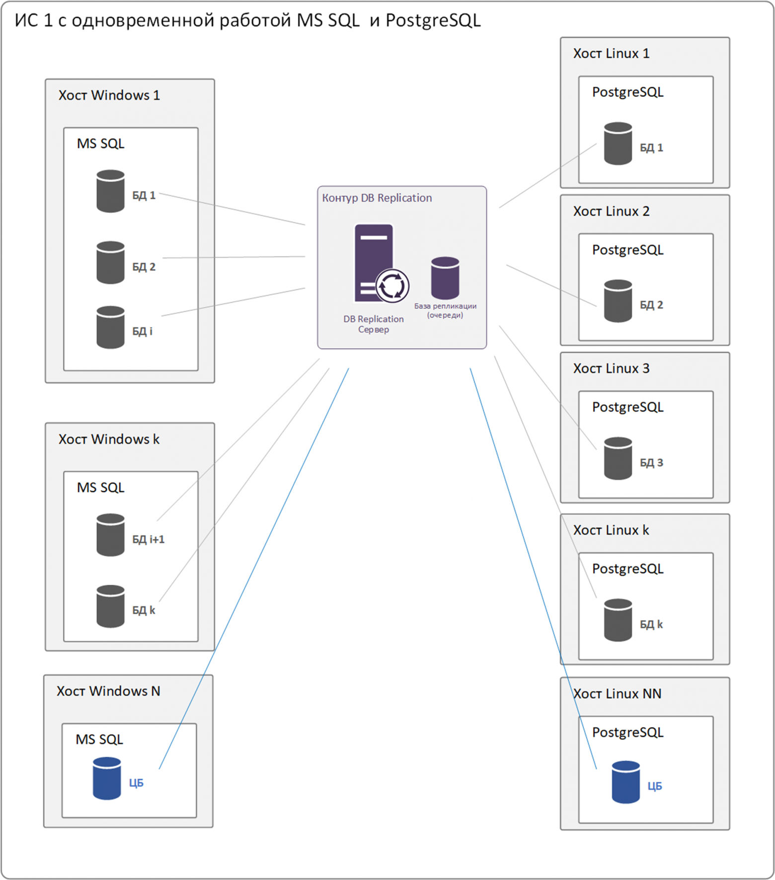 За онлайн синхронизацию всех баз вне зависимости от СУБД (MS SQL или PostgreSQL) отвечала DB Replication. Чтобы было наглядно, вот так выглядит топология распределенной системы с одновременной работой MS SQL и PostgreSQL на период самой миграции и еще несколько месяцев после:
