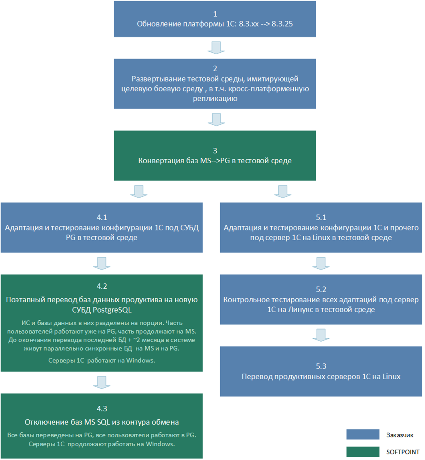 Синим цветом отмечены задачи, которые выполняет заказчик, а зелеными – Софтпоинт. Если посмотреть, то всё, что связано с функциональной частью ИС: тестирование, анализ и адаптация кода, запросов 1С – это зона ответственности заказчика и/или подрядчиков, которые поддерживают ИС в части 1С. Зона ответственности Софтпоинт – это сама миграция данных, обеспечение их целостности и консистентности, контроль за производительностью системы, во время и после миграции, обеспечение обратного моста на случай нерешаемых проблем.