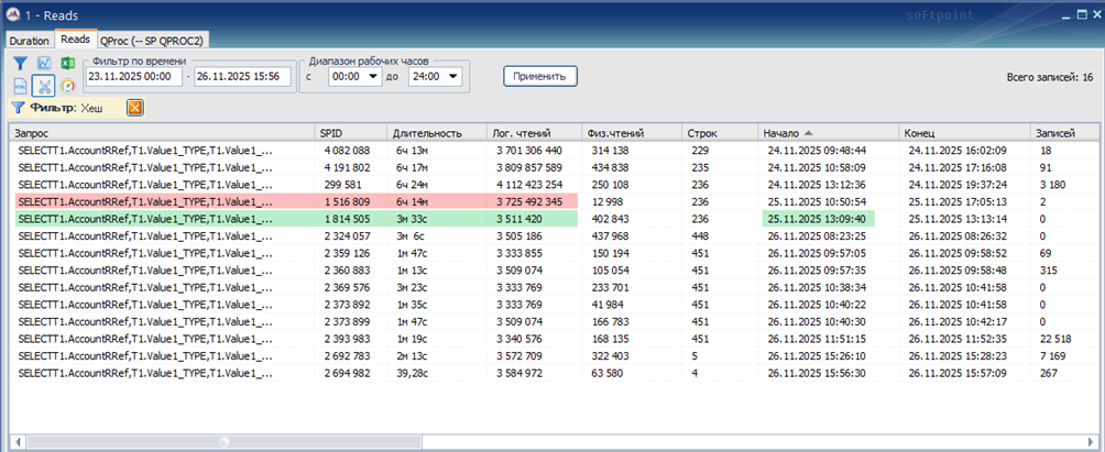 Отчет связан с выполнением фактически одного запроса, и все попытки пользователя хорошо зафиксировались в трассе READS мониторинга Perfexpert: