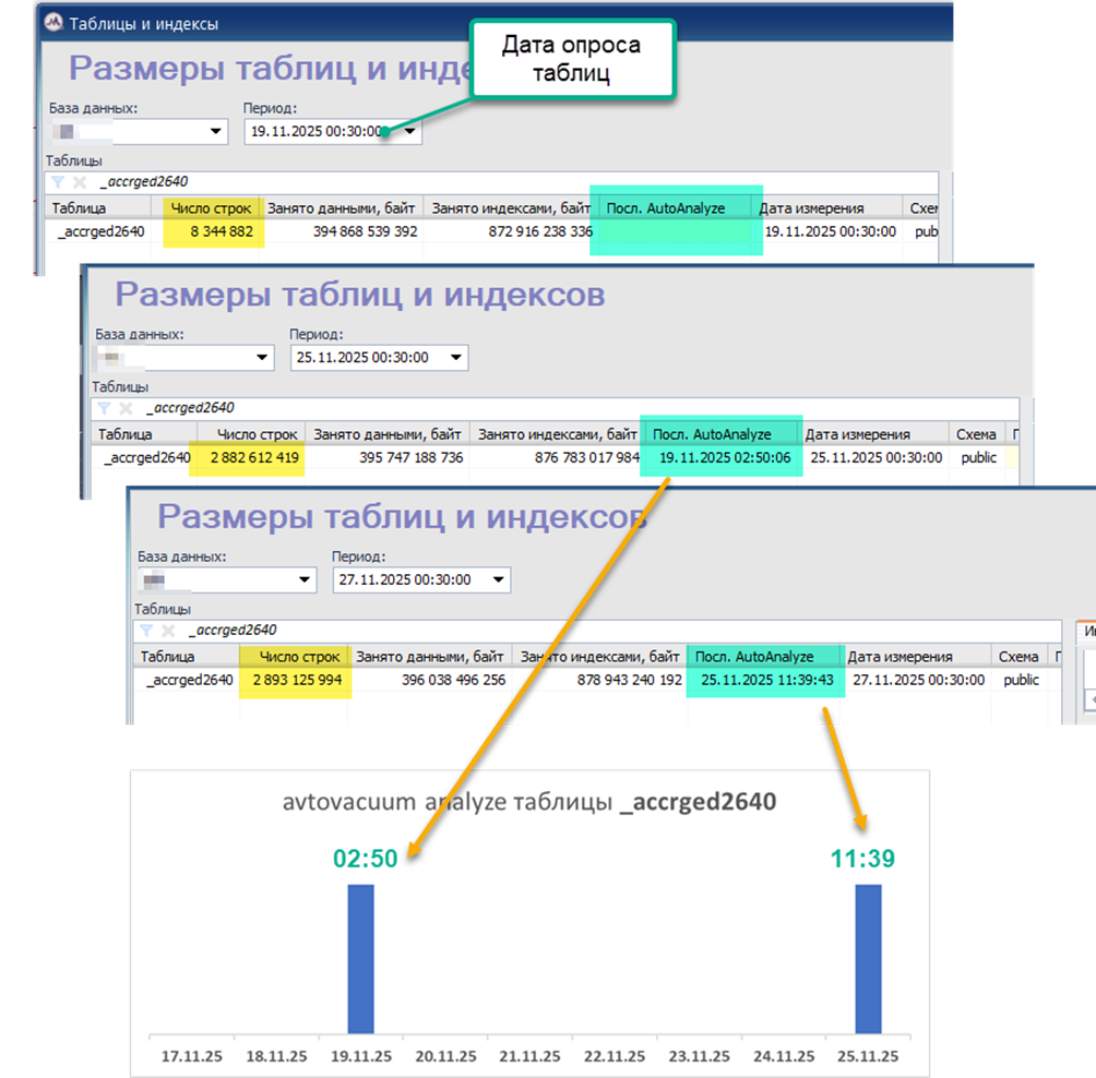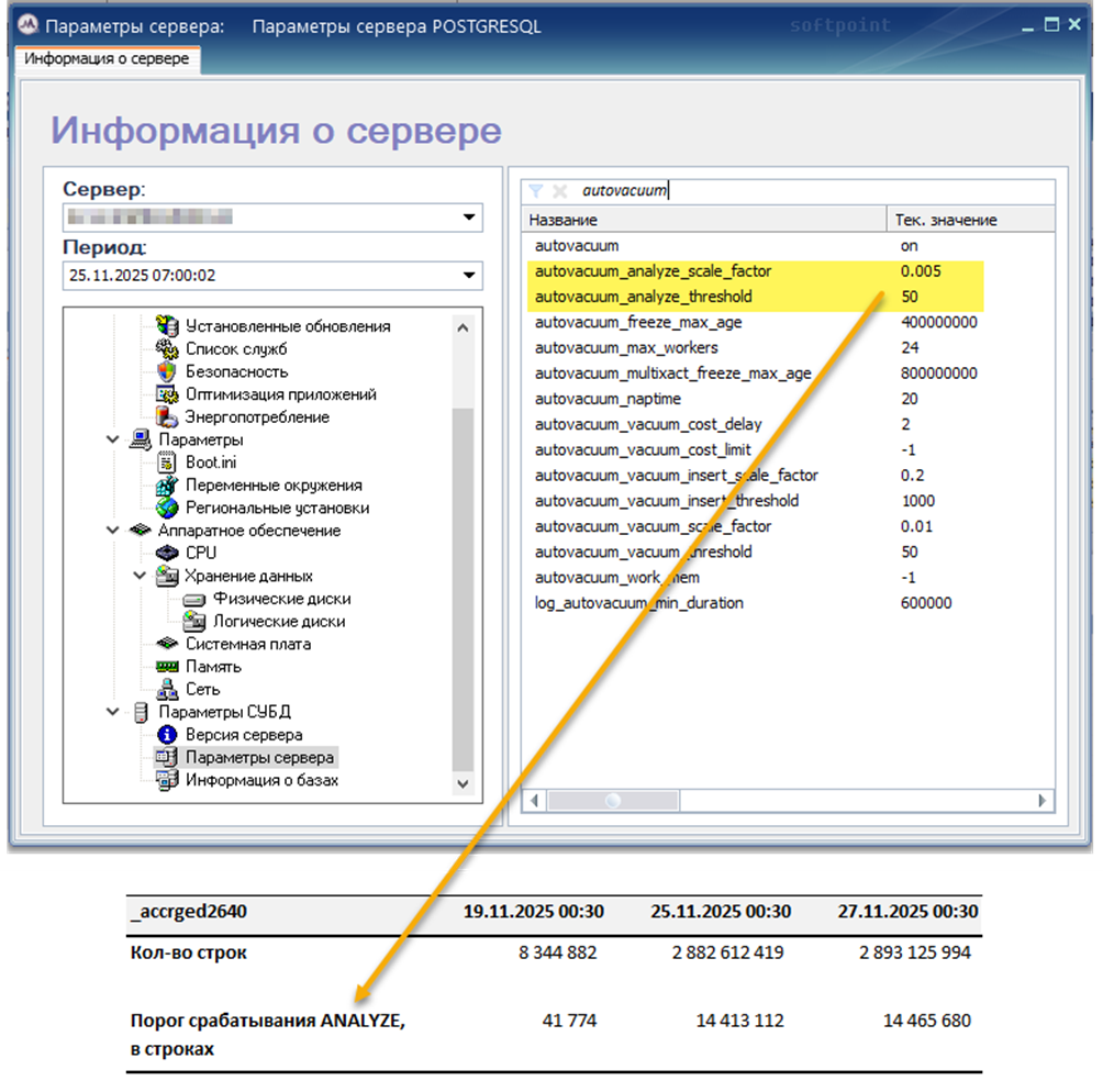 А случилось такое потому, что автообновление 25 ноября сработало только тогда, когда количество изменений в таблице достигло 14+ млн., несмотря даже на то, что параметр autovacuum_analyze_scale_factor выставлен в достаточно маленькое значение 0,5%: