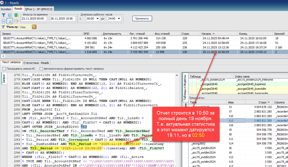 Теперь посмотрим почему же отчет пользователя (=sql-запрос), который запускался 25.11, когда пересчет статистик уже был, всё равно выполнялся долго.