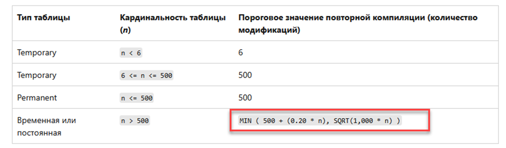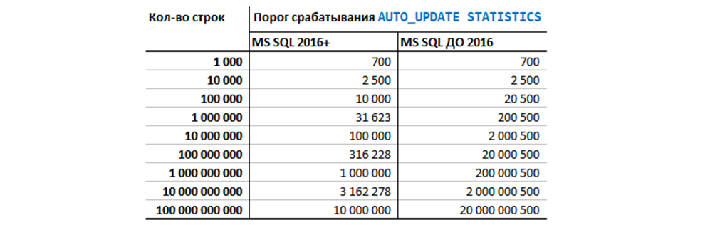 Но есть нюанс. MSSQL, начиная с SQL Server 2016 (уровня совместимости 130), решает, пора ли обновлять статистику, по формуле (в красной рамке):