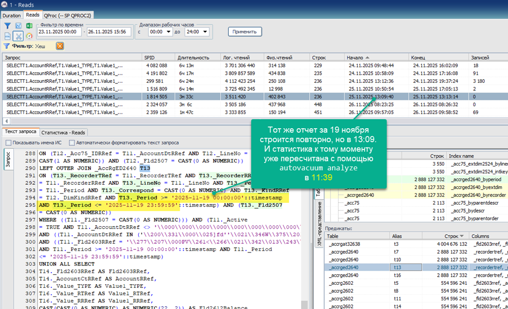 Пользователь получает отчет за 19 ноября и вроде бы последний ANALYZE тоже был на тот момент 19 ноября, но только маленький нюанс – он был в 02:50 утра, т.е. рассчитанные статистики не учитывали всех изменений за этот день. Оптимизатор из-за отсутствия актуальной информации о фактическом количестве строк за указанную дату в таблице _accrged2640 неверно оценивает масштабы данных и выбирает неудачный план выполнения запроса: неправильная последовательность фильтрации и соединения таблиц (Nested Loops вместо Hash Join). Отсюда огромное количество логических чтений и не менее огромная длительность выполнения запроса.